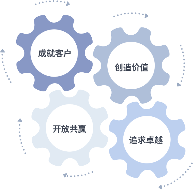 成就客户是一切决策的出发点,创造价值是衡量所有工作的标准,追求卓越是摩天平台做事做人的态度,开放共赢是摩天平台的格局也是最终的结果。价值观的齿轮环环相扣,推动着组织里的每个人不断向前。